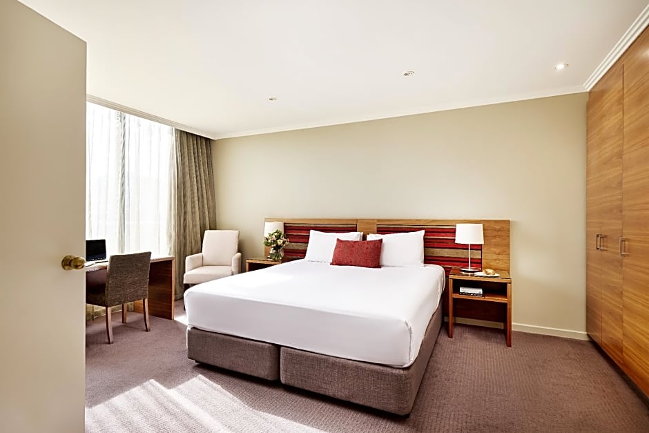 The City View Deluxe King Room is located on the corner of the hotel with windows on 2 sides and views overlooking the city and Albert Park. The 35 sqm City View Deluxe King rooms offers king-sized bed, 55-inch LCD TV, broadband internet access, a desk, en suite and 2 arm chairs.
